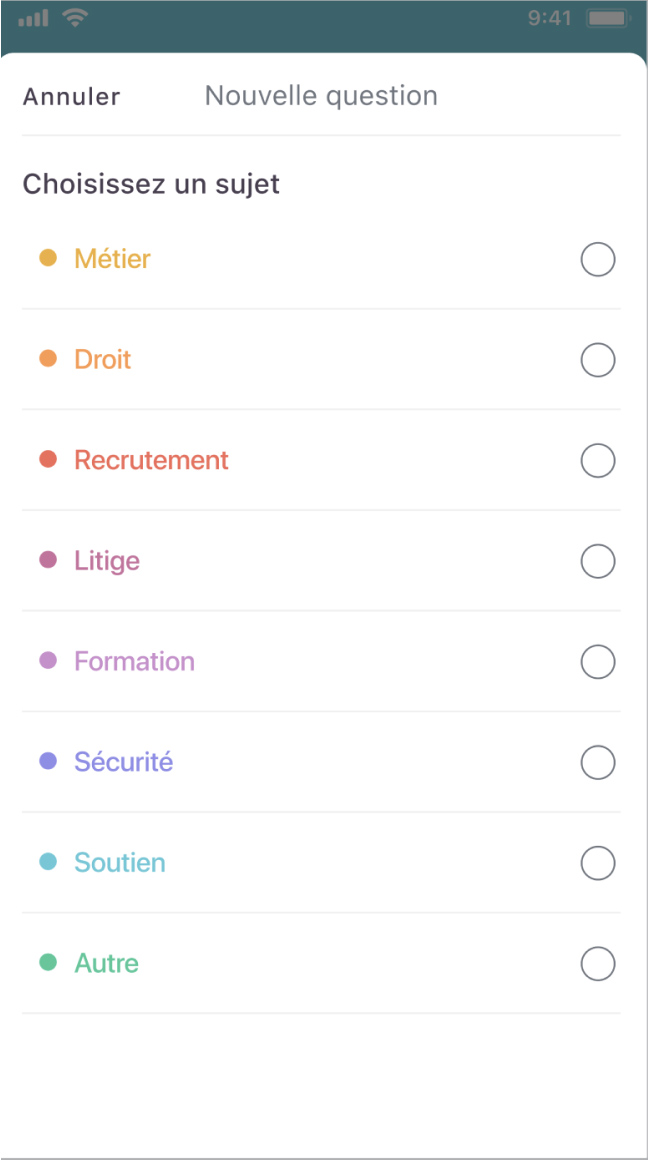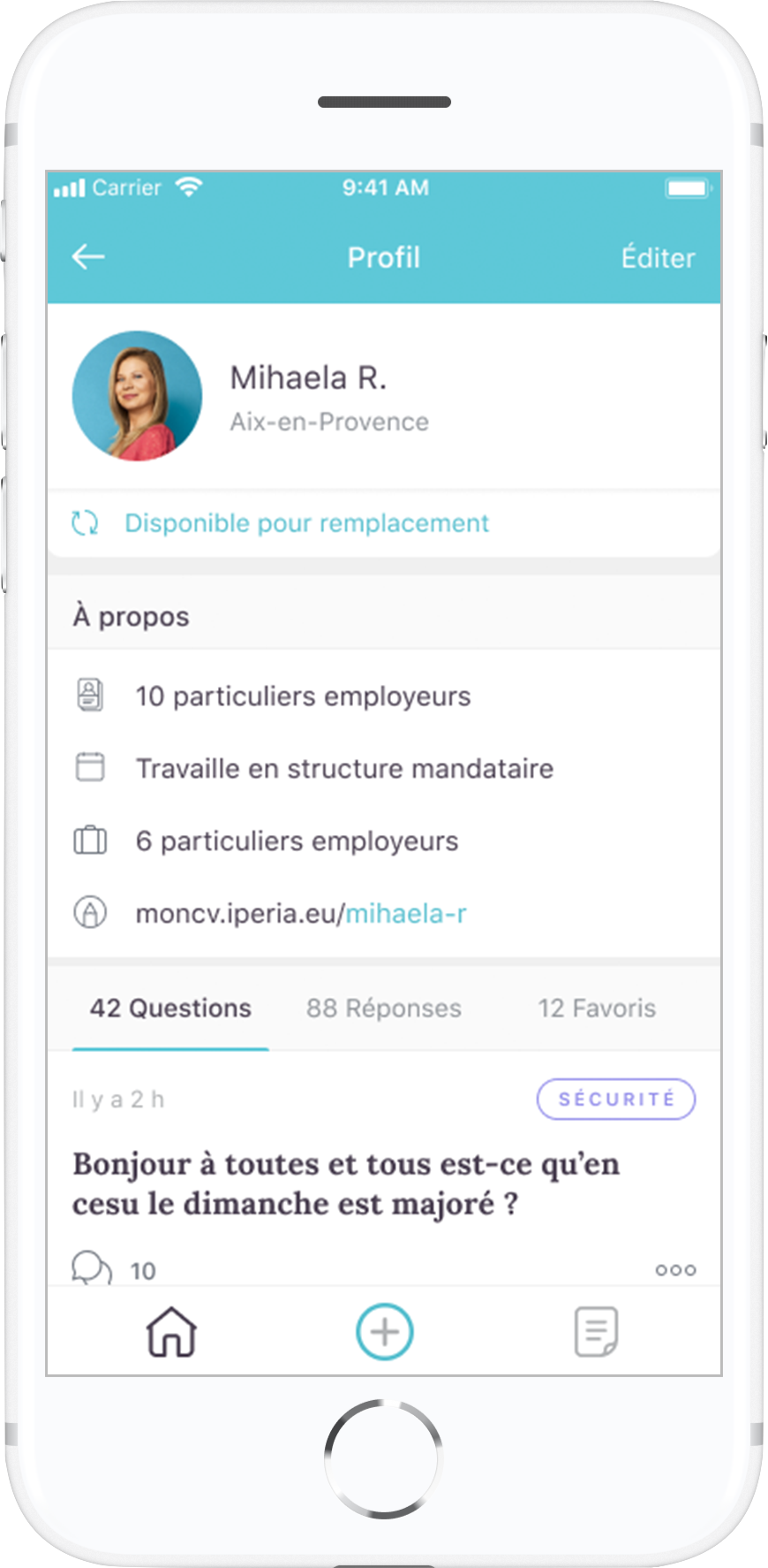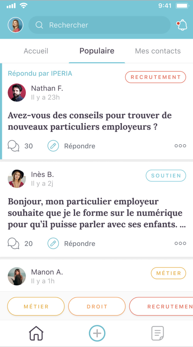 “Je me pose souvent des questions sur mon métier... parfois je ne sais même pas quoi faire ! Avant je cherchais sur Internet mais je n’étais jamais sûre de trouver la bonne réponse. Maintenant, j’échange directement via l’app avec les autres pour avoir leur opinion. Avec ça, je repars reboostée et sûre de moi !”